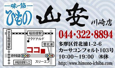 魚市場並みの安さで美味しいひものが買えると評判の「山安」川崎店(府中街道沿い・菅北浦)。「箱根の天然水とミネラル豊富な天然天日塩を使ったまろやかな風味はウチだけ」と店主の滝澤さん。