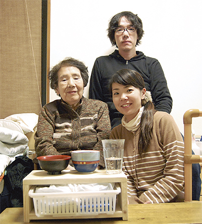 母の高橋民子さんは膝の具合が悪く、座椅子を使って食事をしていたが、2年前、脳梗塞を患ってからは茶碗を持つことが以前より難しくなった。食事をしにくそうにしている母を見て、今年の夏、一夫さんが日曜大工で作ったものが食事台のきっかけ。母が使っている姿を見て、福祉施設で働く摩衣さんがコンテストへの応募を勧めた。「介護用品というと、それっぽい製品ばかりになってしまうけれど、これならインテリアも損ねない。福祉の現場にあったら便利なはず」と実際の介護現場にいるからこそのお墨付き。