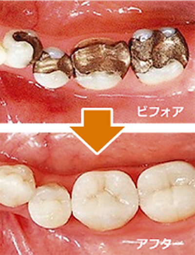 「保険治療で可能な”金属”は経年劣化によってどうしても黒くなってしまいます。5年もすると自然な歯との差は歴然。これに対し自由診療のセラミックの場合、変色することはありません」。セラミックの場合、詰め物で1歯5万円〜、かぶせ物で6万5000円〜。さらに、同院ではその場で歯の画像をコンピュータ処理し、3次元で削りだす装置があるので、最短1日で施術可能。「1日で済めば麻酔も1回で住むので、患者さんの負担も軽減されます」。