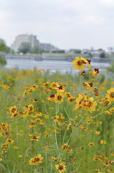 宿河原の稲田中学校裏の多摩川沿いにハルシャギク(別名ジャノメソウ)が黄色い花を咲かせ、河川敷を覆っている。