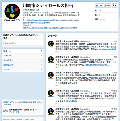 川崎市では、昨年度末からツイッターをはじめとするソーシャルメディア導入の検討を開始。6月に職員向けのガイドラインとツイッターアカウント運用ルールを策定し、今月11日から市民こども局シティセールス・広報室が「kawasaki_pr」というアカウント名で「つぶやき」を始めた。13日にはTVKで現在放送中の市情報番組「LOVEかわさき」の市内での中継日時を投稿。16日午前には、この日午後都内で行われる都市対抗野球に出場する市代表(東芝野球部)の応援を呼びかけるなど、タイムリーな情報を投稿している。 今後の活用について、川崎市広報室では「すでに宮前区が、区30周年の広報手段として同じソーシャルメディアの『フェイスブック』や『ユーチューブ』を活用しているほか、現在各局区が導入を検討している段階」とし、「まだ手探りの状態だが、様々な手法を用いて川崎の魅力を発信していきたい」と前向きな姿勢をみせている。
