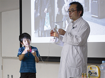 宮城県出身で防災士の阿部清人さんが講師となり、防災を科学(サイエンス)で学ぶ”防災エンス”をテーマに、地震の揺れやメカニズム、手回し発電ラジオやLED電球の仕組みなどを、子どもたちに分かり易く説明。実験キッドを使った様々な企画も多く、興味深く楽しむ様子がみられた。