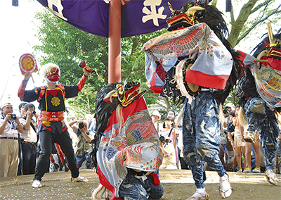 神奈川県指定無形民俗文化財の「菅の獅子舞」が16日、薬師堂であった。多くの見物客が詰め掛け、賑わった。