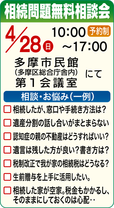 多摩区で今年1月に初開催され、多くの参加者が訪れた同相談会は、今回が2回目。弁護士、税理士、司法書士が一堂に会するため、遺産分割・相続税・相続登記手続・遺言等の相続に関わる全ての相談が無料で受けられる貴重な機会。