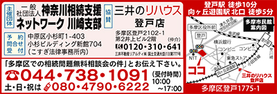 「相続のことはお任せください」。弁護士などが運営する、一般社団法人・神奈川相続支援ネットワーク主催で4月28日(日)、相続の無料個別相談会が多摩市民館で行われる(三井のリハウス登戸店協賛)。完全予約制。申込みは電話で。