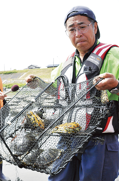 山崎さんによると、多摩川の水中ではミドリガメが生態系の頂点という。多摩川全域に生息し、捨てられたペットが定着するだけでなく、繁殖しているとみられる。雑食性で在来種の稚魚を捕食し、在来種の生育に必要な藻や水草を食べ尽くすこともあるという。