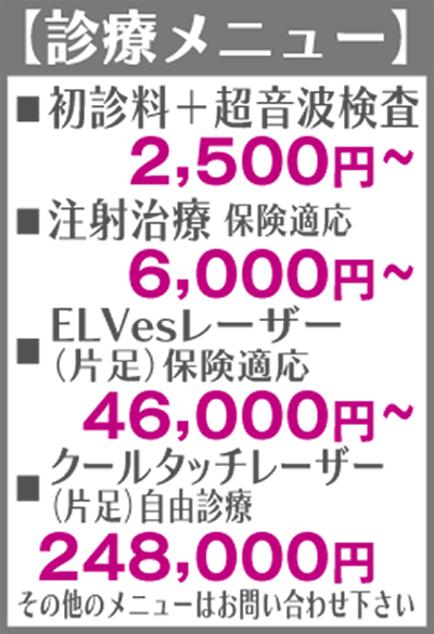 同クリニックでは、細いファイバーを血管内に入れ、静脈瘤に照射し血管の詰まりを改善するレーザー治療を導入。「血管内部の損傷が少なく、安全性の高い治療法です。30分前後で切らずに治療できます。傷跡もほとんど残らず、痛みも少ない治療法です」と阿部院長。