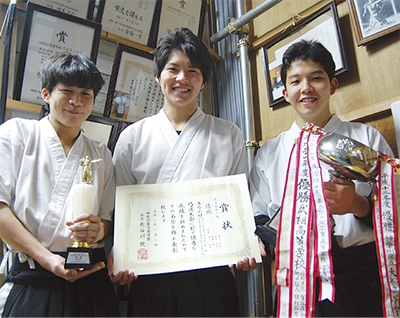 今月10日に行われた神奈川県弓道大会団体の部兼全国高校弓道弓道選抜大会県予選(県立武道館/横浜市港北区)で向の岡工業高校の弓道部が優勝した。メンバーは岡田啓佑さん(2年)、坂本浩太さん(2年)、富樫海さん(1年)の3人。