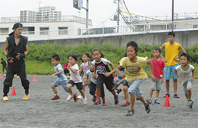 忍者の動きを真似て子どもの身体能力アップ――。こんな一風変わったスポーツ教室「のぼりと忍者塾」が先月29日、登戸の多摩川河川敷で開かれた。