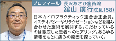 舘山さんが院長を努める長沢あさひ施術院では、肩こり腰痛以外の症状への施術も行っている(初診料5000円)。同院では35項目にわたり問診を行い、痛みの原因を探る。要予約。