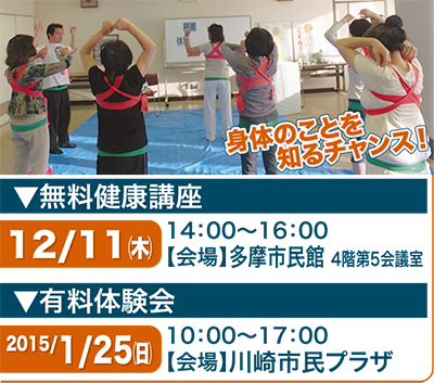 講座では自宅で簡単にできる体操を学べるだけでなく、気になる部分のワンポイント施術も受けられる。要予約。定員になり次第締切。申し込みは電話。動きやすい服装で参加すること。