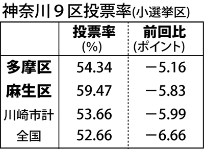 投票率は多摩区、麻生区とも全市、全国を上回った。多摩区が54・34%で前回よりも5・16ポイント減。麻生区は市内で最も高い59・47%だったが、前回よりも5・83ポイント落とした。