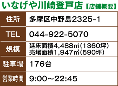 ■いなげや川崎登戸店/中野島2325の1/【電話】044・922・5070/午前9時から午後10時45分まで。