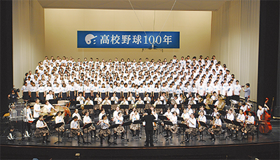 収録には桐光学園高合唱部、日本女子大附属高コーラスクラブ、桐蔭学園高グリークラブ、霧が丘高合唱部、八王子学園八王子高吹奏楽部など神奈川・東京の高校生約380人が参加。「甲子園でプレーする球児たちにエールを送りたい」と抱負を語った後、リハーサルを重ね、収録に挑んだ。高校野球の全国大会が始まり100年を迎える節目でもある今年、生徒たちは「高校野球100年」のロゴの入ったTシャツを身にまとい、全力で歌い、奏でていた。