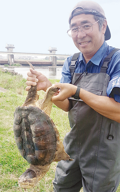 多摩区布田の多摩川で今月1日、噛まれると大けがにもなるカミツキガメが捕獲された。子どもたちの夏休みを前に、捕獲した市民団体「おさかなポストの会」の山崎充哲代表は「川で見慣れない生物を見たときは近づかないように」と呼びかける。