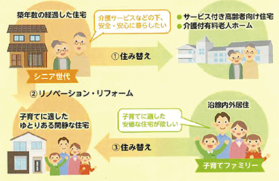 今回のエリアではこうしたサービスの拡充を図り、高まる住み替え需要に対応した事業を展開したい考え。例えば、駅の近くに住みたいと希望する戸建て住宅のシニア世帯に対して、子育て世帯への賃料を活用して転居できるといった仕組みが想定される。空き家対策や高齢者の介護負担の軽減、女性の社会進出の支援などにつなげ、「日本一暮らしやすい沿線の実現をめざす」としている。