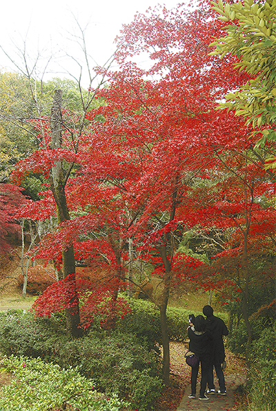 3連休の最終日となった23日、七草峠付近のノムラカエデは真っ赤に色づいていた=写真。通りかかった来場者は感動の声を上げながら、手持ちのスマートフォンやカメラで色づいた葉を撮影していた。隣接している日本民家園内の古民家と紅葉をバックに記念写真を撮る家族の姿も見られた。