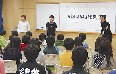 この授業は、子どもたちにはっきり話すことの大切さを伝え、豊かなコミュニケーション能力を付けてもらおうと、同劇団が社会事業の一環として行っている。