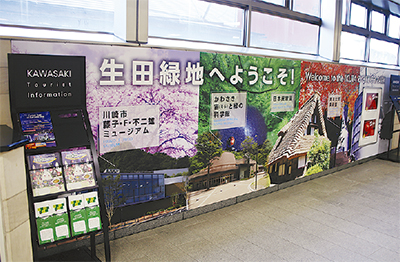 生田緑地周辺を訪れる外国人観光客に観光情報を提供しようと、川崎市は先月4日、小田急線登戸駅構内に「KAWASAKI Tourist Informationコーナー」を設置した=写真。