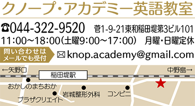「英語を少しでも話せるようになりたい」「本物の英語を身につけたい」。そんな人は、稲田堤に新規開校する「クノープ・アカデミー英語教室」を訪ねてみては。