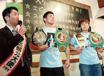 日本と東洋太平洋ミドル級王座を3月に獲得した西田光選手(川崎新田ボクシングジム)と、東洋太平洋スーパーフェザー級王座を同月獲得した三好喜美佳選手(同)の祝賀会と激励会が5月8日、登戸の中華居酒屋ダイニング鮮藍坊で開かれた。主催は同ジム後援会(片山義規会長)。