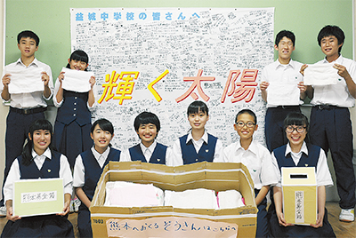 顧問の佐藤和子教諭は「自分がもしそうなったら、ということを(生徒会の)一人ひとりが真剣に考えていた。その思いが全校生徒に伝わったのでは」と話す。生徒会2年の松本凪菜(なな)さん(13)は「熊本ではみんな辛いことがあって大変だと思う。明るい未来に向かって頑張れるように、できることをやっていきたい」と胸中を語った。