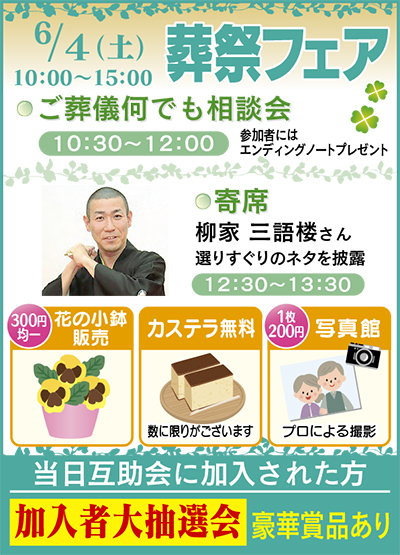 さらに午前10時30分から正午まで、葬儀のプロがわかりやすく説明する「ご葬儀何でも相談会」を実施(参加者にエンディングノートをプレゼント)。祭壇や仏壇・仏具、返礼品など葬儀に関する展示も。