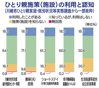 2010年の国勢調査によると、市内の一人親世帯は8304世帯。市による一人親家庭への実態調査(14年)では、市が提供する支援施策の周知が行き届いていないことが明らかになった。市が一人親世帯に向けた施策の認知度合いを調査したところ、寡婦(夫)が受けられる所得控除である寡婦(夫)控除の認知度合いが最も低く、市住宅支援給付相談センター事業やショートステイ(子育て短期利用事業)なども認知が低かった。