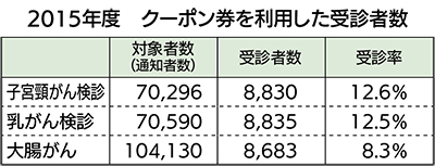 このクーポン券を利用すると、子宮頸がん、乳がんとも検診代の自費分にあたる1000円が無料になる。しかし、昨年度このクーポン券を利用した人の割合は、対象者に対して子宮頸がん検診が12・6%、乳がん検診が12・5%にとどまった。