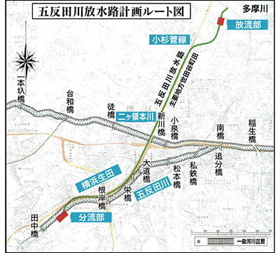 川崎市ではこのような状況を改善しようと、抜本的な治水対策として1992年度、五反田川の洪水時に地下トンネルへ水を流入させ直接多摩川に放流する「五反田川放水路整備事業」に着手。計画高水流量の負担を軽減させるため、五反田川と多摩川の水位差を利用し地下河川で直接多摩川へ放流する計画です。これにより、面積にすると341・2ヘクタール、家屋数にすると7089戸の浸水想定被害が解消される予定です。