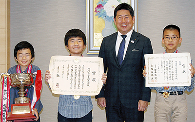 夏に日本棋院会館(東京都)で行われた第13回文部科学大臣杯「小・中学校囲碁団体戦」全国大会で優勝した市立東菅小学校の重川明司君(4年)、佳吾君(6年)兄弟と熊谷大河君(6年)の3人が先月24日、福田紀彦市長を表敬訪問した。