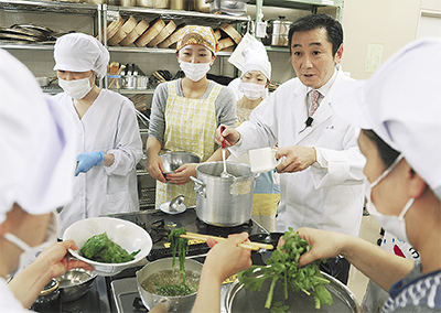 前半は市食品衛生協会が認定する「手洗いマイスター」である小出社長が、手洗いの方法や重要性について講義。調理実習では季節野菜を盛り込んだ「秋の焚き合わせ」に、実践と指導を踏まえて、グループごとに挑戦した。小出社長は「同じ食材でも時間のかけ方などいろいろな調理法がある。和食を通じて、自然の食材と香りを楽しんでほしい」と参加者に語りかけた。