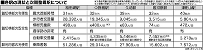 両駅の1日の乗降者数を比較すると、稲田堤駅は5万1286人、中野島駅は2万9014人と稲田堤駅の方が約2万人も多い状況が伺えます。そのほか、踏切横断についての歩行者交通量も中野島駅より稲田堤駅の方が上回っています(下表参照)。