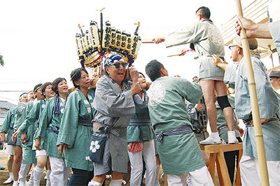 15日の「宵の宮」では、城下、仙谷、芝間、野戸呂・天宿の4地区の神輿が八雲神社に集結=写真。宮出しでは老若男女が各地区の神輿を担ぎ、「わっしょいわっしょい」と威勢の良い声を響かせていた。