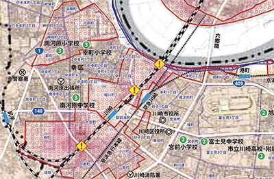 豪雨等による近年の浸水被害多発に伴い、川崎市は多摩川と鶴見川の洪水避難地図(洪水ハザードマップ)の川崎区版と幸区版を、5月に改定。河川整備で基本になる降雨量の想定を引き上げたもので、市内の残り5区も今年度中に改定し、公表する予定だ。