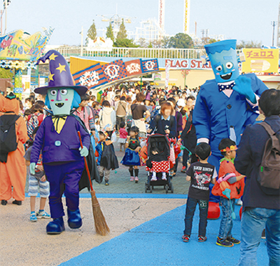 来園者がモンスターたちと一緒に園内を歩く「モンスタートリックパレード」=写真=やハロウィン仕様のお化け屋敷など、参加型イベントが目白押し。期間中は仮装(アイテム2点以上)で入園料が無料になる。