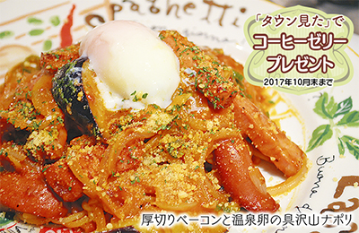 厚切りベーコンにソーセージ、温泉卵までついてボリューム満点のナポリタンは食欲の秋にぴったり。隠し味のデミグラスソースも美味しさのポイントだ。夜には2杯目からアルコールが半額になる「ハッピーアワー」も実施中(月・火・木曜、18時〜21時)。