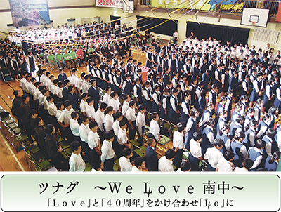 終盤では、40周年を記念したテーマ「ツナグ〜We Love 南中」宣言と題し、代表生徒が登壇。「時代や流行が変わっても行事にかける情熱は変わりません」「先輩たちがつくり上げてきた伝統を守ります」と、新たな歴史をつくっていく決意や関係者への感謝の気持ちを語りかけた=写真右。最後は参加者全員で校歌の『生命燃やさむ』を歌い、式典を締めくくった。