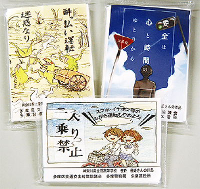 秋の交通安全運動の一つとして行われた今回のキャンペーン。啓発物のティシュには3年生の石橋秀之助さん、木下和紀さん、笹野優姫さんのデザインが起用された=写真下。二人乗り禁止を呼びかけるイラストを描いた笹野さんは「高校生は二人乗りが多いイメージ。少しでも減ればいい」と話していた。石橋さんがデザインした飲酒運転禁止の啓発物は、12月に行われる飲酒運転根絶キャンペーンでも配布されるという。