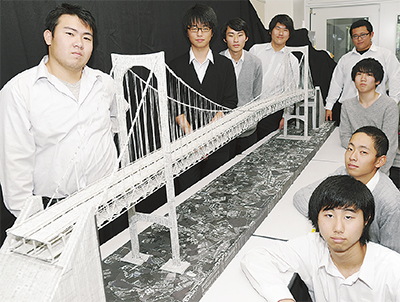 この作品は同校が3年時に取り組む課題研究の一つで、吉川平教諭(55)の指導のもと、建設科の模型製作班9人が組み立て班と部品を作る班に分かれて手がけた。リーダーで、現地取材や組み立て班の班長を担った石川耕作君(17)は「最高の出来栄え。橋をつるワイヤーロープの曲線や柱の仕上がり感がすごい」と充実感をにじませる。