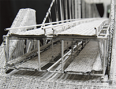 県立向の岡工業高校(堰)建設科都市工学コースの3年生グループが、新聞紙でレインボーブリッジの模型を作り上げた。実物の250分の1、全長約3・5メートル。週3時間ペースで約60時間かけて製作。作品は10月20日、21日の文化祭「向友祭」で展示された。