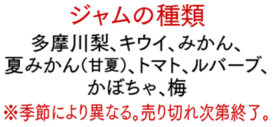 地元の梨農家から提供される規格外の梨を使った手作り生ジャム。砂糖控えめ・無添加・保存料なしにこだわり製造している。一番人気の多摩川梨の他、川崎産の野菜や果物を使って、製造販売。人気商品のためお電話で注文を。