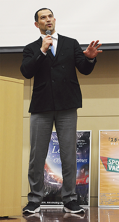 ハンマー投げの競技を昨年引退し、東京医科歯科大学教授、東京2020スポーツ局長兼スポーツディレクターを務める室伏さん。選手の環境づくり、バランスや即興を重視したトレーニング方法について話した。五輪や世界選手権の日本代表に14回選ばれたが、9回はメダルを獲得できなかった体験を例に「失敗を恐れずにチャレンジしてほしい」と学生らにエールを送った。