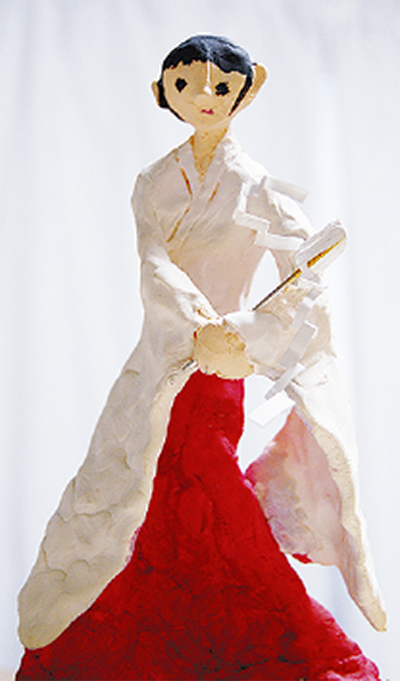幼少期から神社や寺院に興味があったという青戸さん。自然と「巫女さん」に憧れ、中野島小6年の時、自分の将来の姿をテーマに作った作品は巫女姿だった=写真下。中野島稲荷神社に通う中で奉賛会のメンバーに金子善光宮司を紹介してもらうと、祭礼や舞の研修会などに参加。高校生になり、初めて巫女として正月を迎えた。「自分で言葉遣いを調べたりして、最初は肝が冷えた」と振り返る。