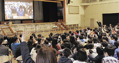 国立極地研究所などによる「教員南極派遣プログラム」で昨年末、昭和基地入りした山口教諭が、南極に関心を持ってもらおうと衛星回線を使った授業を企画。3〜6年生約550人が参加した。