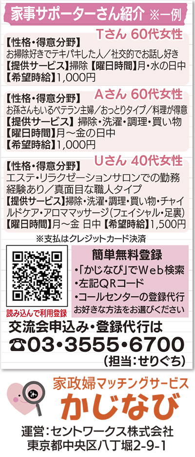 家事依頼者と提供者をマッチングするWebサイト「かじなび」は、1時間2000円(諸経費込)程、1時間から利用できる手軽さが受け、利用登録者が増えている。