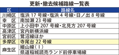 高齢木の増加で倒木や通行障害などが生じている街路樹を整備しようと、川崎市は初の管理計画を打ち出した。根上がりが連続している市内7区の8路線を「更新・撤去候補路線」に指定し、土壌改良や樹木の撤去などを行う。歩行者や道路利用者の安全を確保しながら、並木を管理する方針だ。