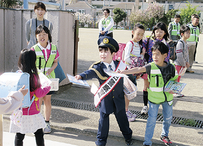 春の全国交通安全運動に合わせたキャンペーンが今月13日、登校時の下布田小学校で行われ、同校の小田島匠君(4年)が一日警察署長を務めた。