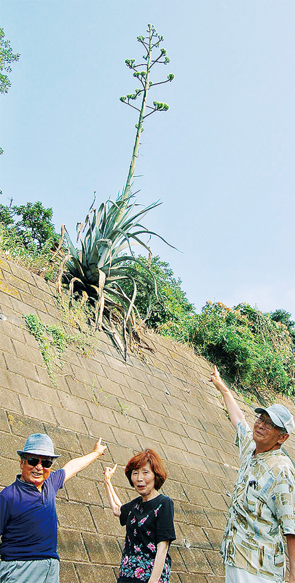 開花までに30〜50年かかると言われているメキシコ原産の植物「リュウゼツラン」。宿河原と栗谷の区内2カ所でぐんぐんと茎を伸ばし、つぼみが膨らみを増している。