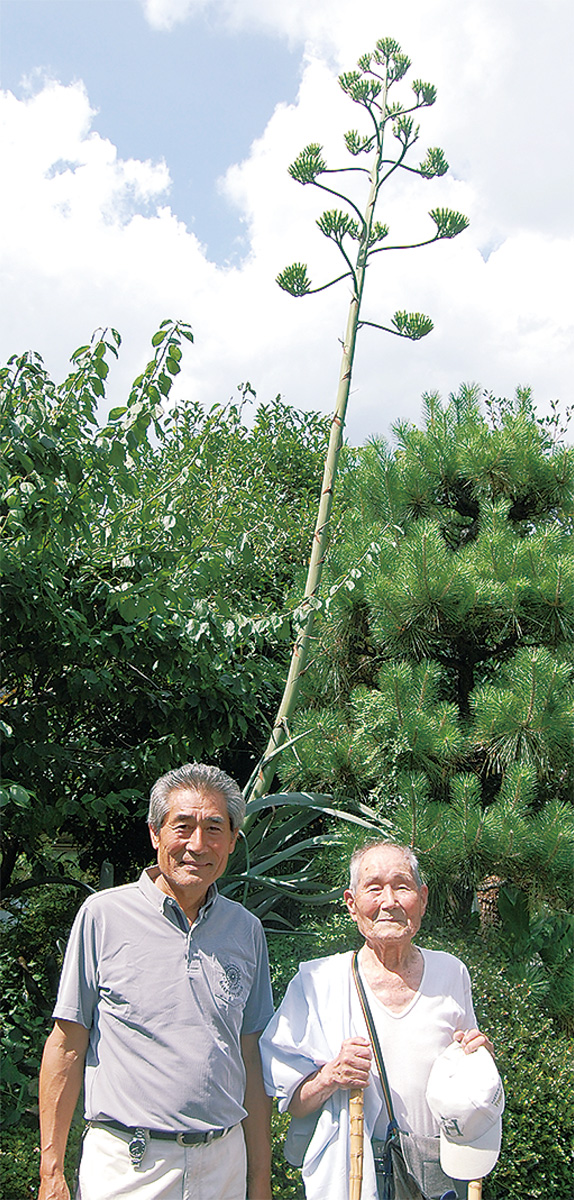 このリュウゼツランは、庭仕事が好きな父親の政治さん(99)が植えたもの。潤一さんは「自分が高校生の時にはあったから、50年以上前のことだと思う」と語る。政治さんは「こんなに立派になるとは。長生きしたおかげで見られた」と開花を待ち望んでいた。